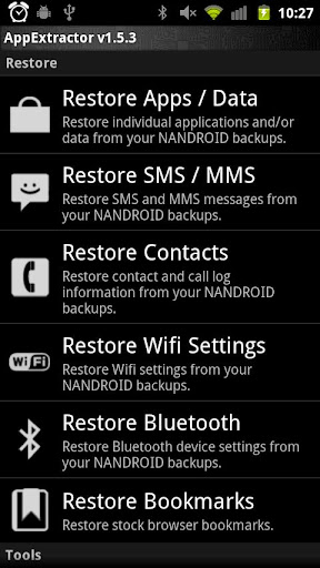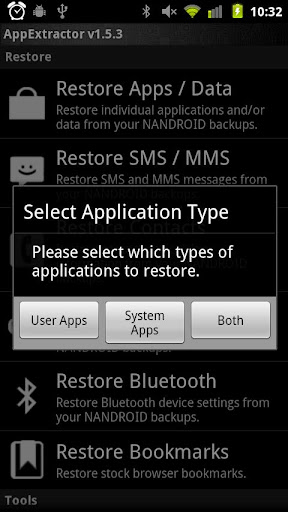AppExtractor is a tool which will allow you to restore individual applications, data, SMS, and MMS messages from your ROM Manager backups.