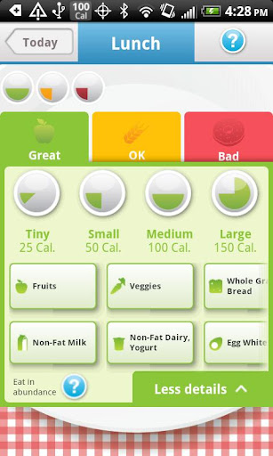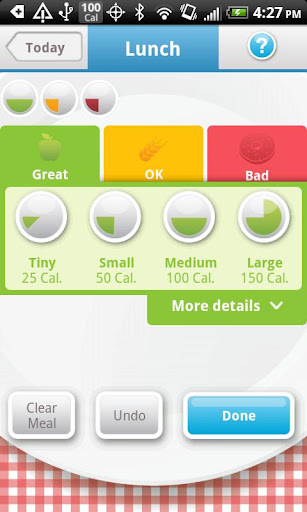Calorific uses the three-color traffic light system to keep you aware and accountable. Just classify your food into Great (green), OK (yellow), Bad (red) categories and off you go. Eat an apple, and you log a green. A coke or candy is red. Not sure what color or size? Then look it up in our Food Search. As soon as you’ve logged a meal, Calorific will give your day a star rating -- use this to improve your next meal.