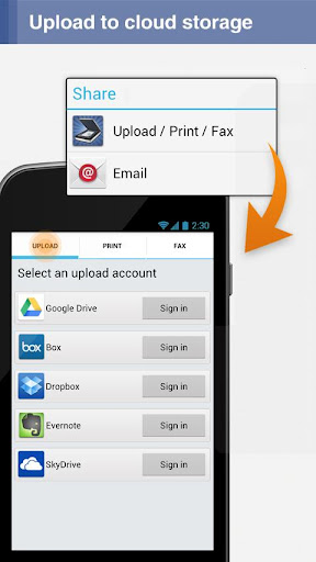 11. Cloud storage—Upload files to online storage such as Google Docs, Dropbox, Box.net, Evernote and SkyDrive