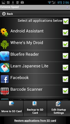 ExtremeSpeed can improve your Smart Phone's start up speed by allowing you to select which applications and processes you would like to open when you’re Smart Phone starts up.Android minimum requirements: Android 1.6 DONUT