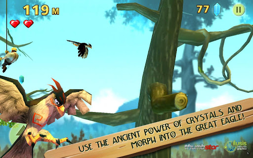 Protect the skyland forests from the lumberjacks, collect the crystals and get awesome power-ups and artifacts! Use the ancient mystic power of the crystals and morph into the great eagle to go further and protect the treetops. You are Ciellu, the last of the Skyrunners, an ancient tribe that protects the Skyland forests. Can you uncover the mystery behind the Skyrunner tribe and rescue your missing friends in this fast-paced side scrolling, platforming adventure?