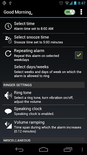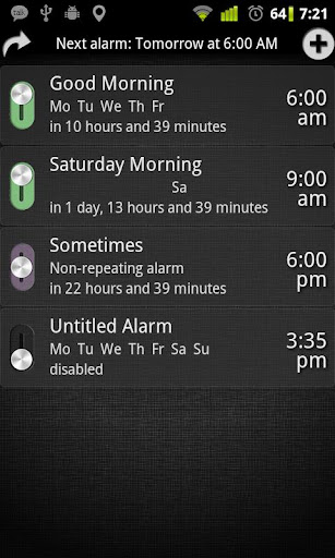 AlarmDroid is a feature-rich alarm clock application. It is created to give every Android-User the opportunity to wake up his(her) own way, not caring about whether he(she) is an early bird or a morning grouch.