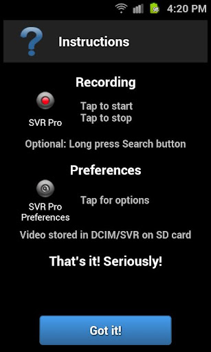 Secret Video Recorder Pro is developed and distributed by Zero Noise Apps. All rights reserved. This app is licensed, not sold. By downloading the app, you accept our EULA available on our website at http://zeronoiseapps.com. App is licensed for individual, private use only. For use by companies, please contact us for corporate license information.Android minimum requirements: Android 2.1.x ECLAIR MR1